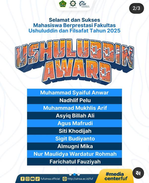 Tahun 2025 menjadi tahun istimewa karena sebanyak 30 mahasiswa berhasil meraih penghargaan dalam dua kategori besar, yakni akademik dan non-akademik. Kedua kategori tersebut mencerminkan wajah mahasiswa Fakultas Ushuluddin dan Filsafat yang tidak hanya unggul dalam kapasitas intelektual, namun juga menorehkan prestasi dalam bidang seni, olahraga, serta kompetisi berbasis keagamaan. Pada kesempatan tersebut Wakil Dekan Bidang AUPK Dr. H. Khoirul Umami, M.Ag membacakan SK penetapan mahasiswa berprestasi tahun 2025.