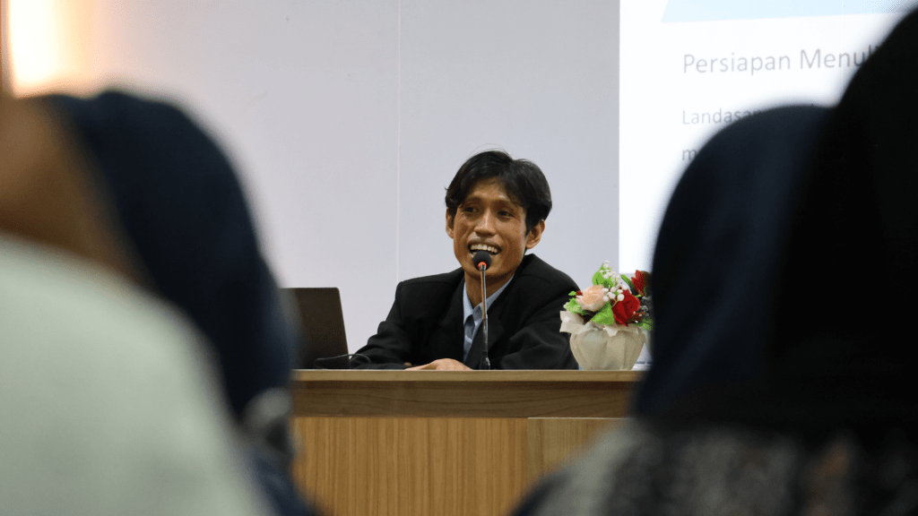 Selanjutnya, Bapak Alaika menyampaikan materi mengenai mindset seorang penulis. Beliau menekankan bahwa penulis harus memiliki pola pikir yang objektif, kritis, analitis, dan sistematis. Selain itu, beliau juga mengulas kesalahan-kesalahan umum yang sering terjadi dalam penulisan ilmiah dan memberikan panduan tentang cara menulis latar belakang yang baik dan benar.